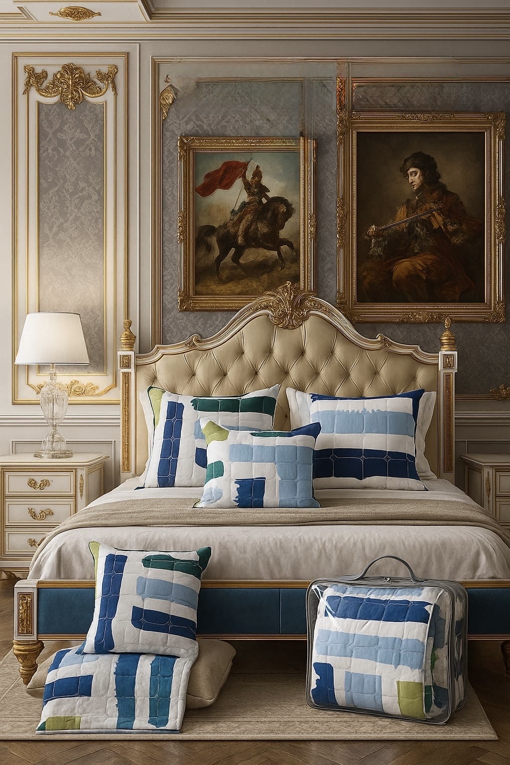 Transform your bedroom into a regal retreat with this stunning floral leaf printed bedding set. Featuring bold hues of teal, mustard, and burnt orange, the set beautifully contrasts with the classic wooden bed frame and vintage wall art. Intricate leaf patterns add a modern flair to the timeless elegance of the room, complete with ornate wall sconces, classical paintings, and a warm ambient glow from the bedside lamp. Perfect for those who appreciate a fusion of tradition and trend.