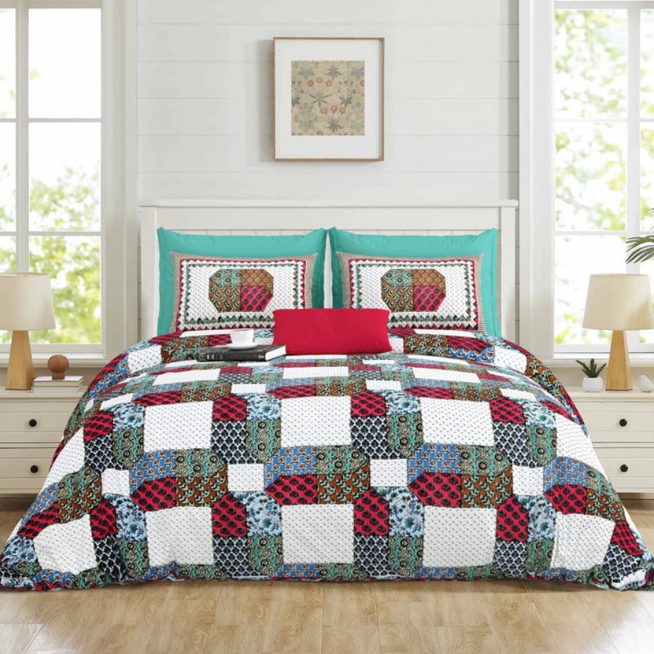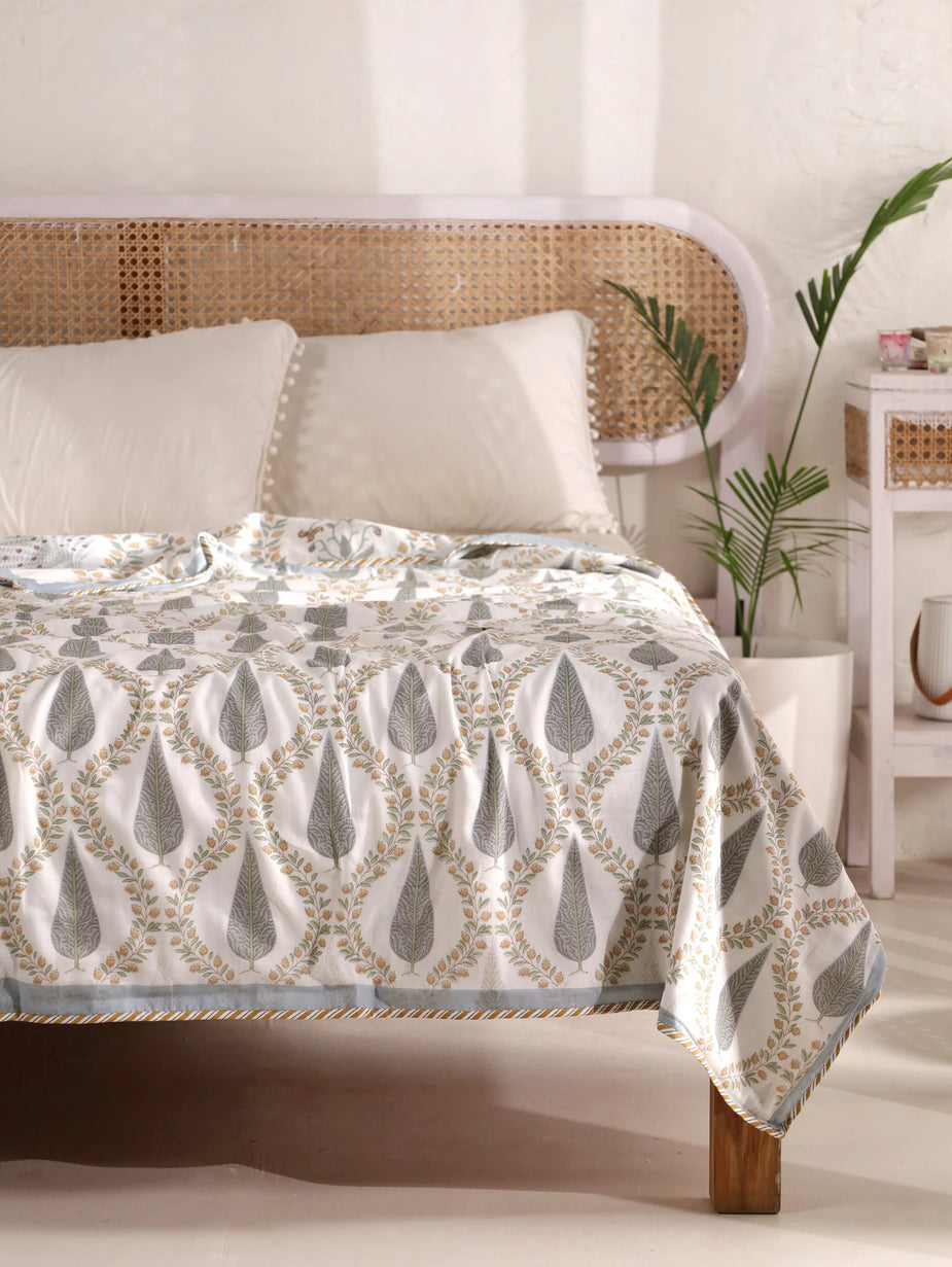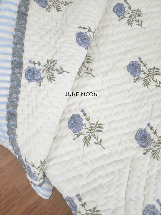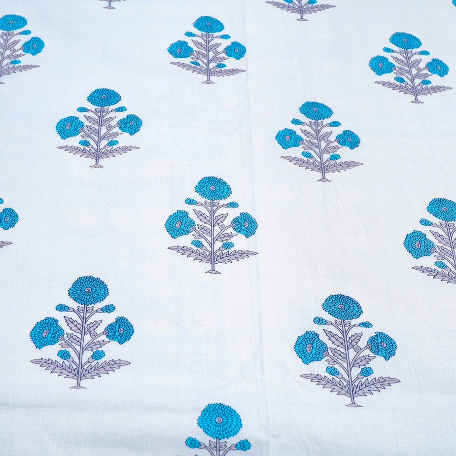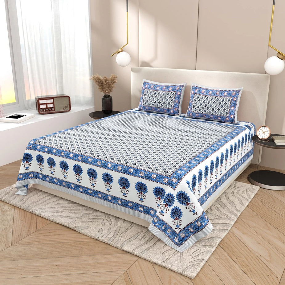 Hand Block Printed Cotton Bedding Set of 5 Pieces- Blue Floral Buta (90×108 inches)