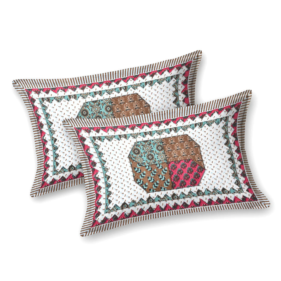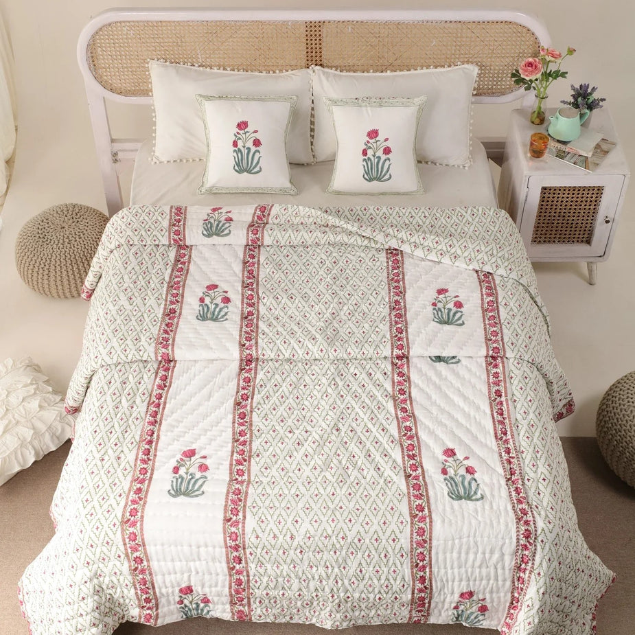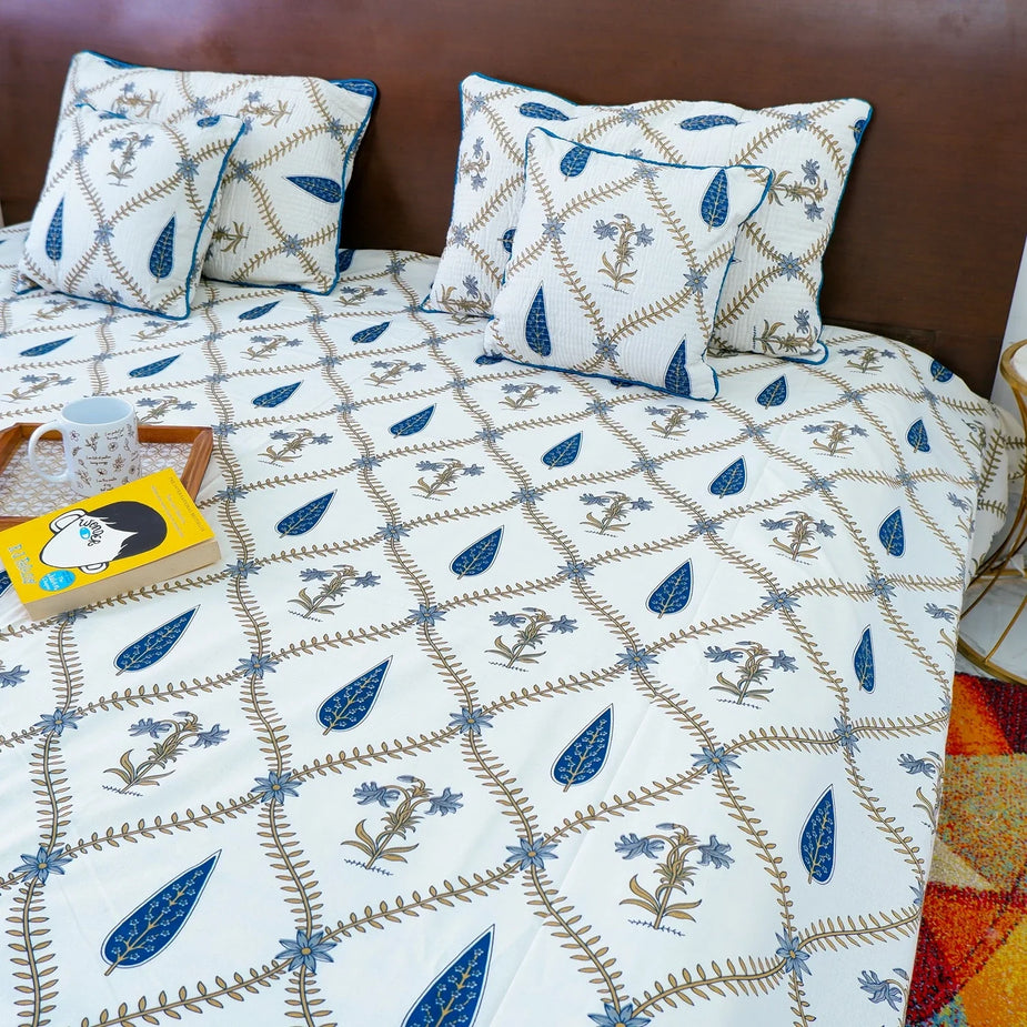 Hand Block Printed Cotton Bedding Set of 5 Pieces -Blue Floral Jaal (90×108 inches)